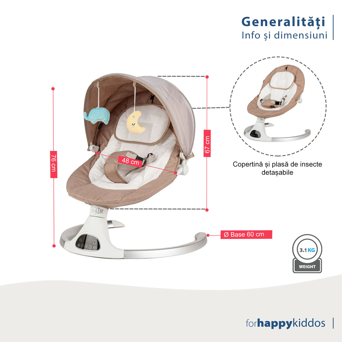 Temporizator practic: Setați durata de funcționare a balansoarului (cu oprire automată), pentru a economisi energie și pentru a asigura un somn odihnitor.