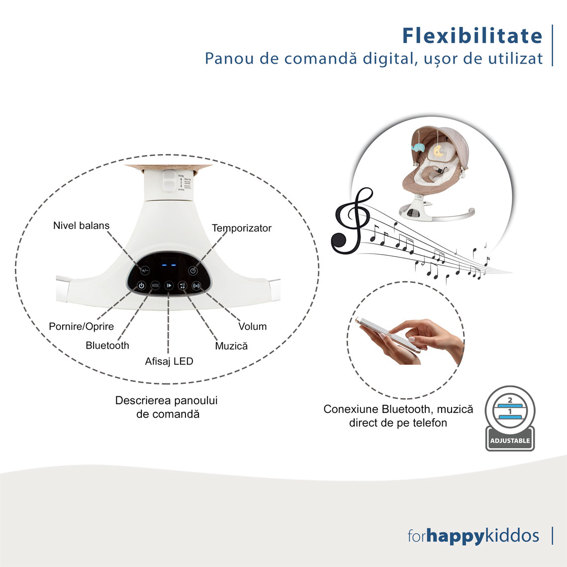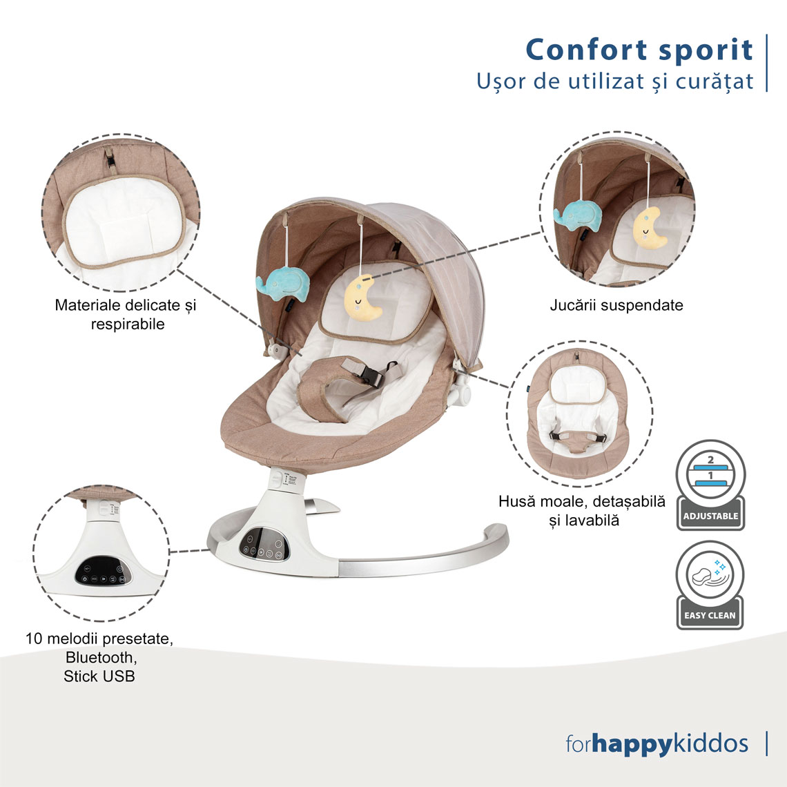 Muzică de înaltă calitate: Alegeți dintre cele 10 cântece de leagăn prestabilite sau conectați-vă telefonul prin Bluetooth sau un stick USB pentru a reda muzica preferată, prin difuzorul cristalin, integrat în balansoar.