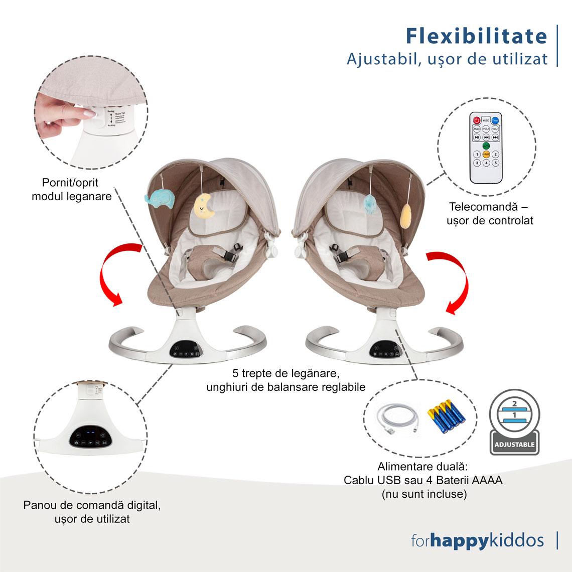 Alimentare duală: Balansoarul poate fi alimentat prin adaptor AC (cablu USB) sau cu 4 baterii AAAA (neincluse), oferindu-vă flexibilitate și portabilitate oriunde vă aflați.