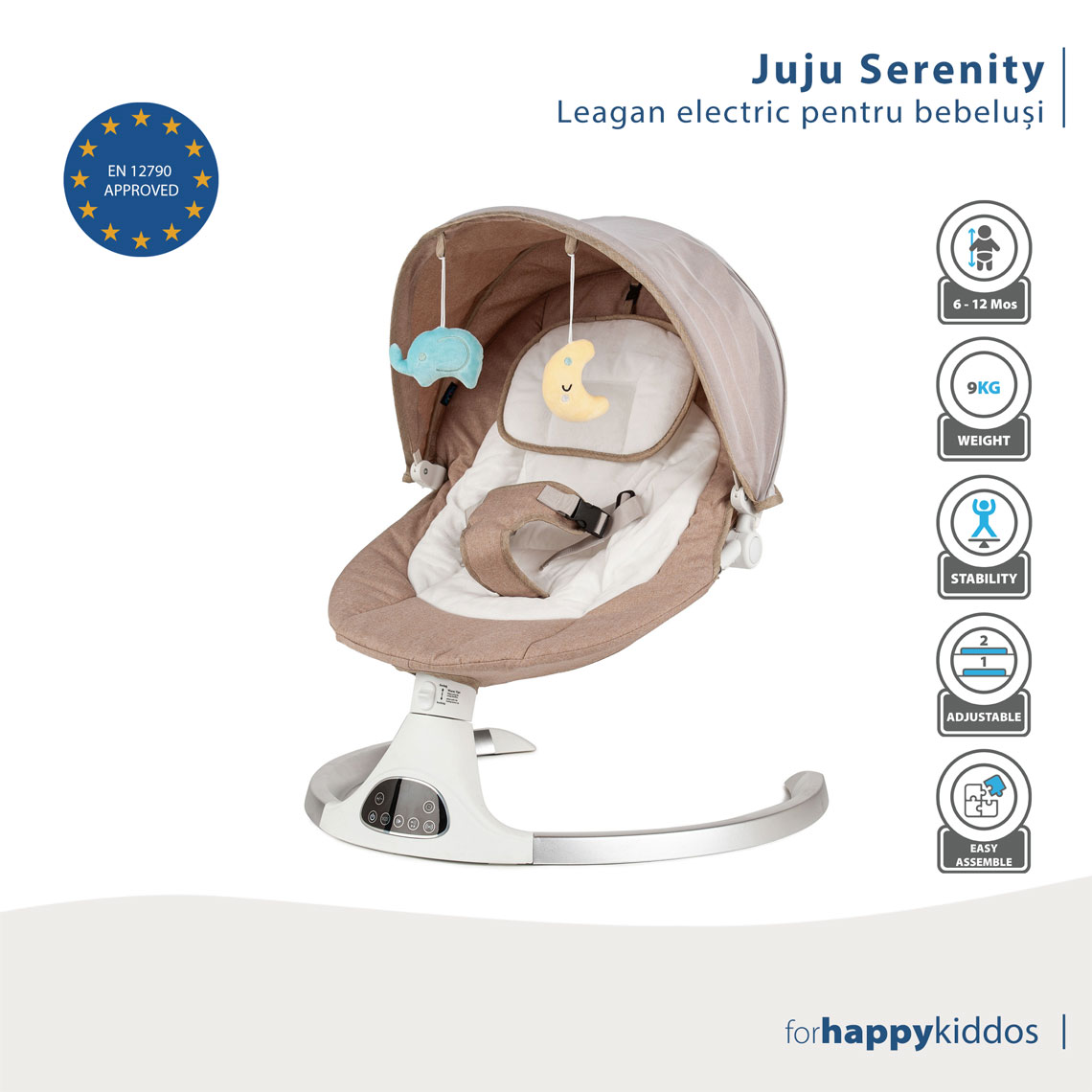Conceput cu responsabilitate și atenție la detalii, balansoarul Serenity a fost creat tocmai pentru aceste momente. Certificat conform standardelor europene de siguranță EN 12790, acest balansoar a fost gândit pentru a oferi micuțului tău (cu o greutate de până la 9 kg) senzația de siguranță și confort. Designul său modern și elegant se integrează perfect în orice locuință, în timp ce materialele de calitate transformă fiecare utilizare într-o experiență de neuitat. De la somnul dulce, legănat, la momentele de joacă pline de bucurie, Serenity transformă fiecare clipă într-o amintire prețioasă, oferindu-ți și ție câteva minute de respiro prețios.
