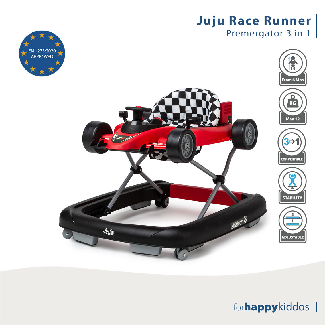 Premergătorul 3 in 1 Juju Race Runner este certificat in conformitate cu standardele europene de siguranța EN 1273: 2020.