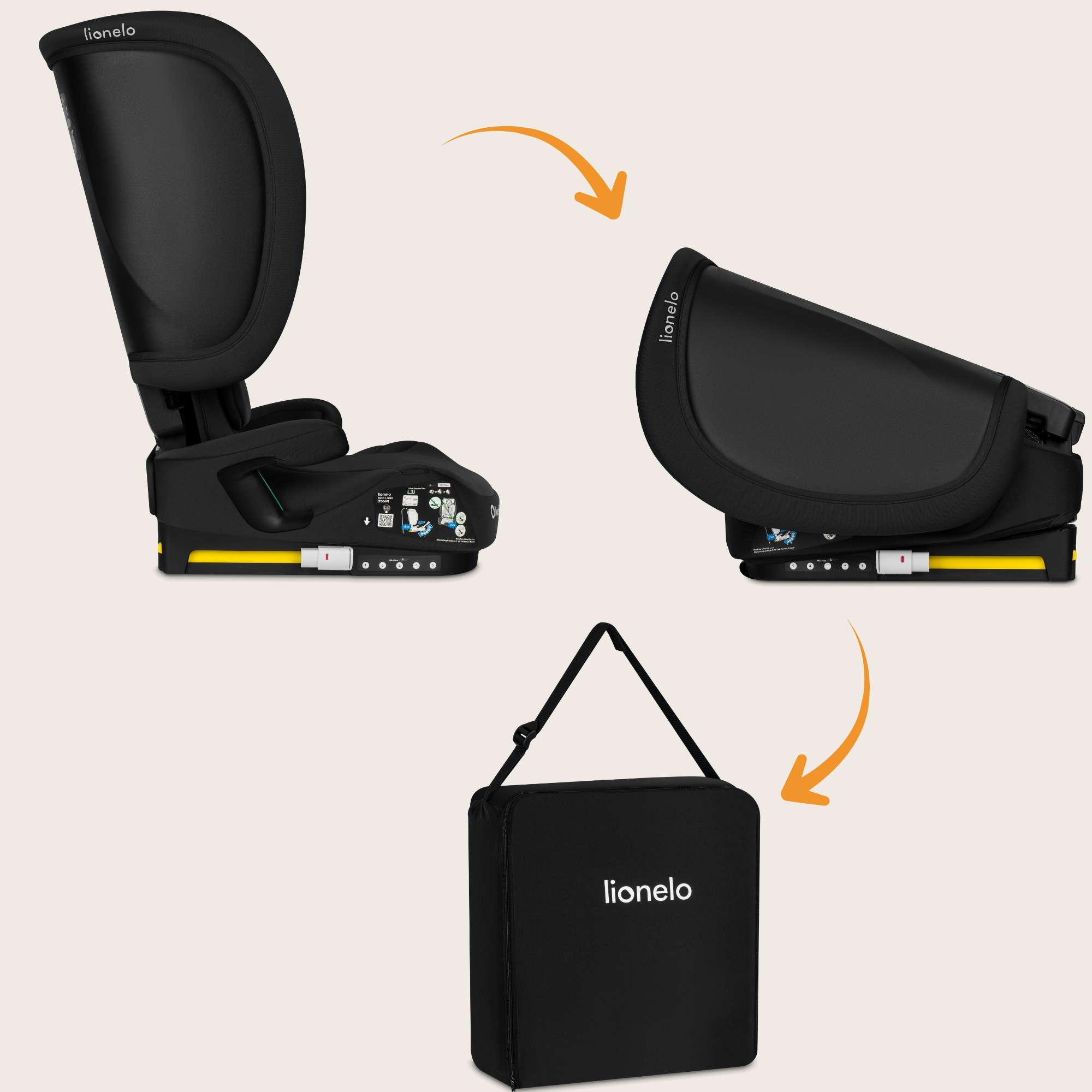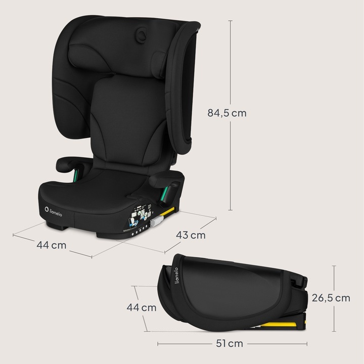 Scaun auto pliabil, Lionelo, Orin, i-Size, 100-150 cm, Tetiera reglabila in 14 pozitii, Spatar in 4 pozitii, Isofix+Top Tether, Sezut ergonomic, Husa transport, Suport sticla, Negru Carbon