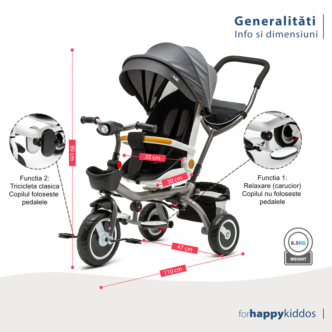 - Funcția 1: Relaxare, când copilul este mic si nu ajunge la pedale își poate sprijini picioarele pe suportul pentru picioare; tricicleta este acționata de adult