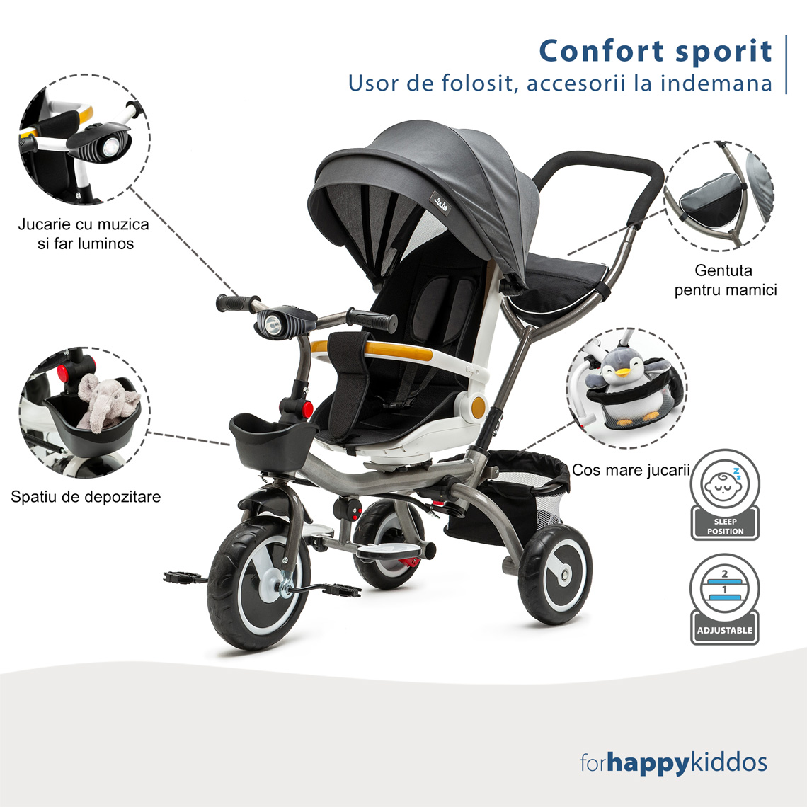 - Spătar reglabil in mai multe poziții, pentru a fi cat mai plăcut copilului, inclusiv poziție de somn