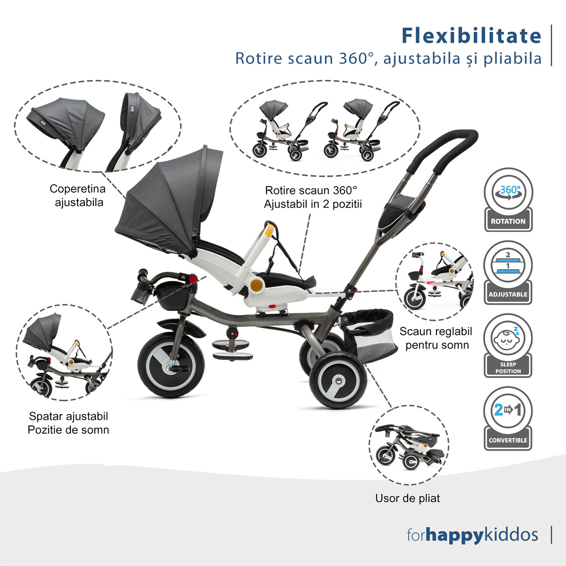 - Sistem de rotire 360° ce permite poziționarea cu fata sau cu spatele la părinți